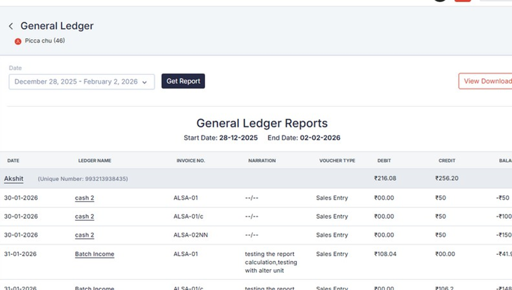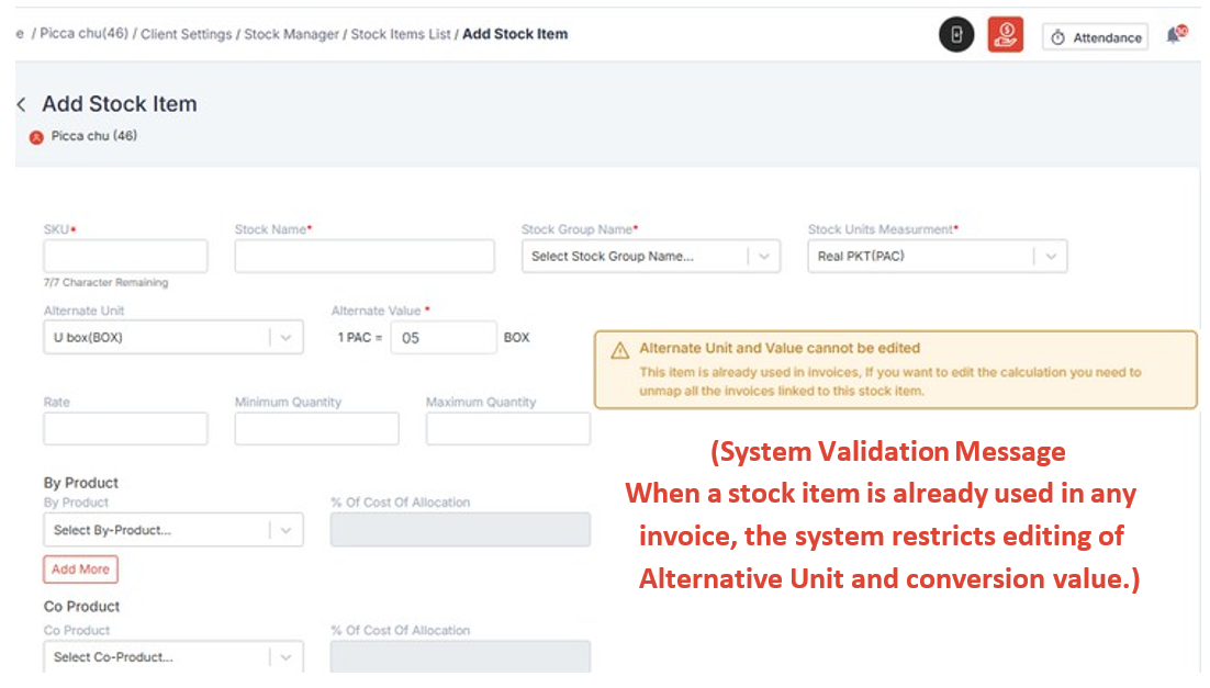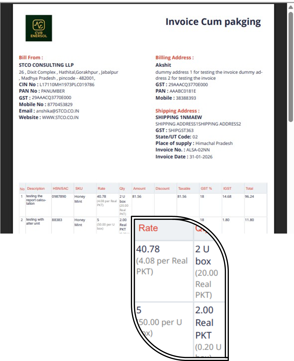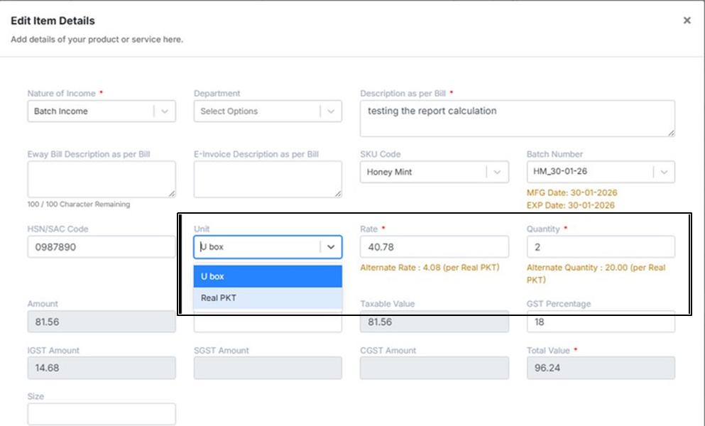 Quantity and rate are auto-calculated based on the selected unit. System also shows: