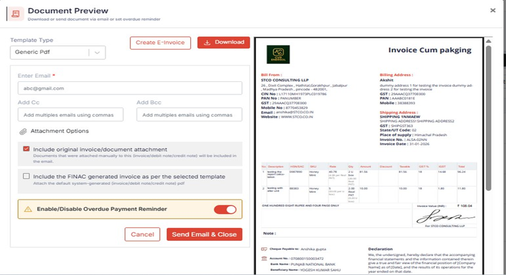 shows the system-generated FINAC Invoice PDF